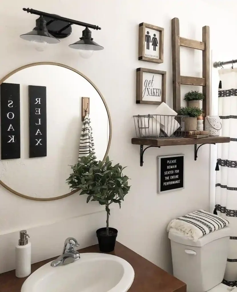 This half bathroom uses rustic farmhouse elements to create a warm and welcoming look. The wooden ladder shelf beside the mirror adds height and provides a place for small plants and decorative pieces. A round mirror softens the straight lines in the room, while the black industrial light fixture adds contrast against the white walls. Floating shelves above the toilet hold baskets and towels, helping the space stay organized while still feeling stylish.