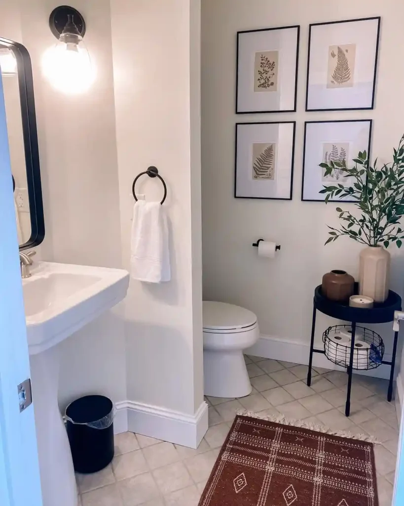 This half bathroom keeps the design clean and minimal while adding personality through framed wall art. Four botanical prints create a small gallery wall that gives the space character. A slim black side table beside the toilet adds storage for extra paper and decorative pieces. The neutral palette helps the room feel calm and uncluttered.