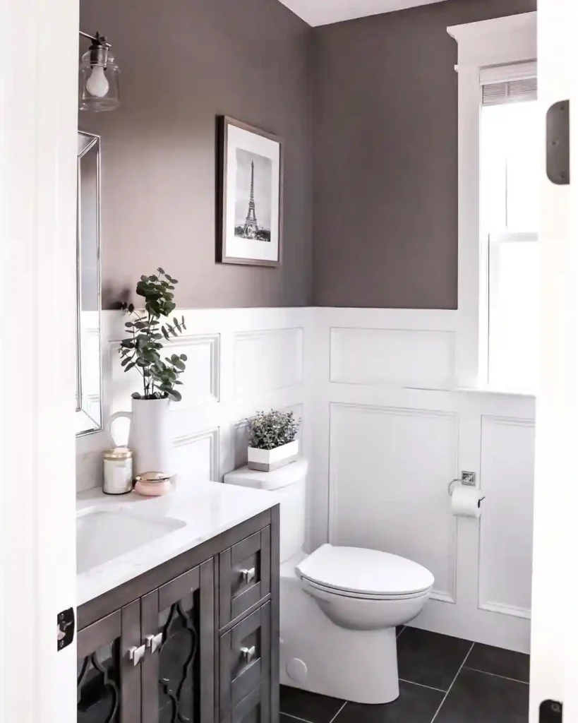 Two-tone walls add depth and interest to this powder room. The lower white paneling keeps the space feeling crisp and classic, while the darker upper wall color adds warmth and contrast. A simple vanity and small plant complete the design without making the room feel crowded.
