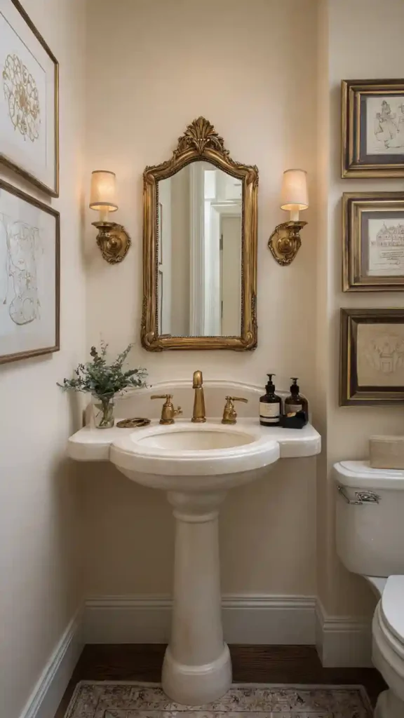 A vintage-style half bathroom brings charm and character into the home. Classic elements like pedestal sinks, framed mirrors, antique-style faucets, and decorative wall art help create this nostalgic look. Soft colors, patterned tiles, and traditional lighting fixtures often work well in this design. Vintage décor pieces such as old trays, glass bottles, or framed prints can add personality while making the space feel warm and collected over time.