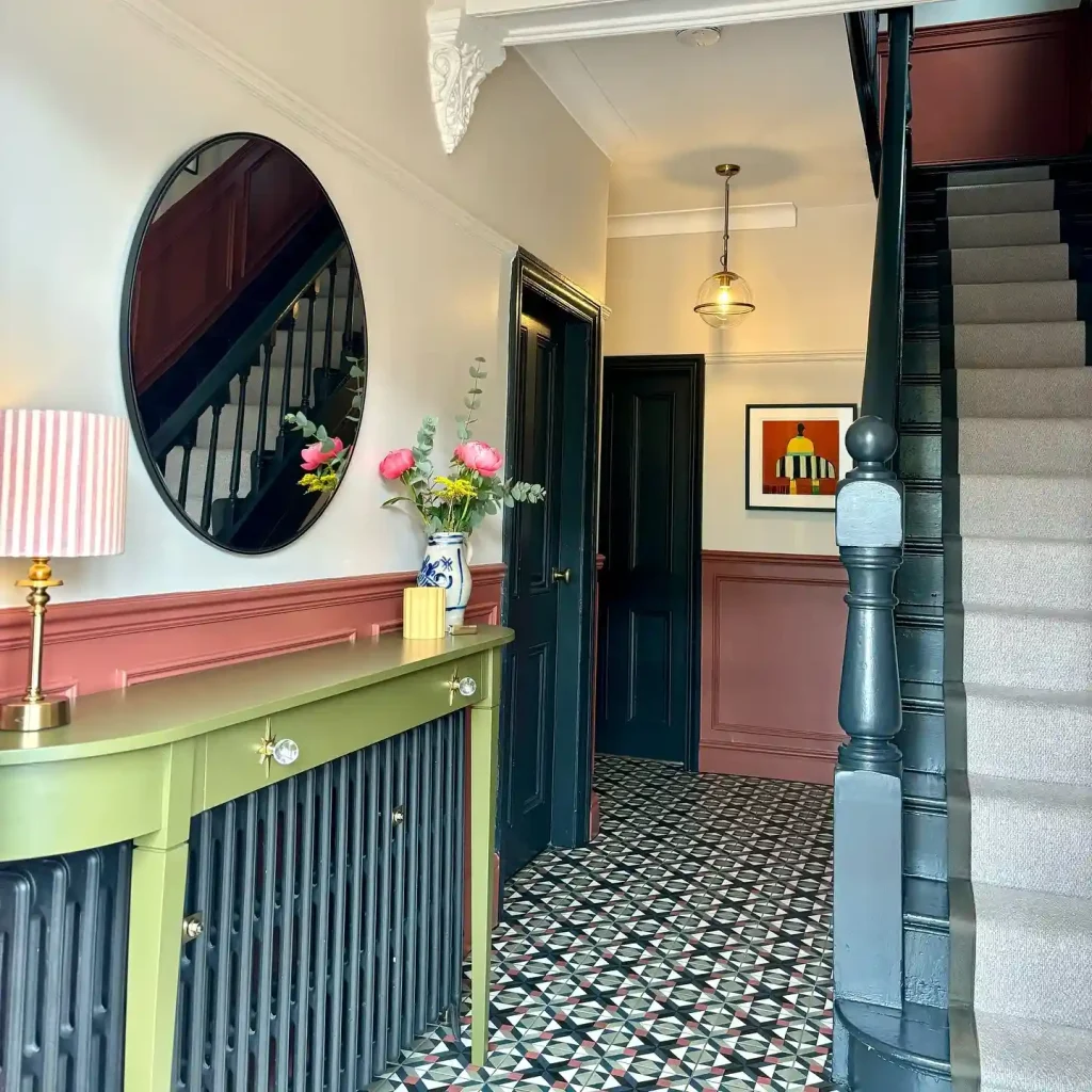 A statement hallway featuring bold colors and decorative accents. The olive-green console table provides extra storage while complementing the geometric floor tiles. The large round mirror and stylish lamp make the space visually appealing. This idea is perfect for those who love to combine function with bold aesthetics.