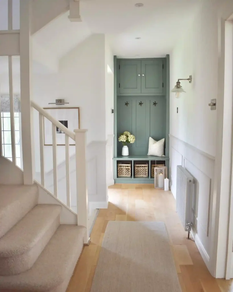 A built-in green storage unit with hooks and benches creates the perfect hallway organization system. Each section provides space for coats, shoes, and bags, making it ideal for families. The overhead cabinets ensure that seasonal items can be stored away, keeping the hallway clutter-free.