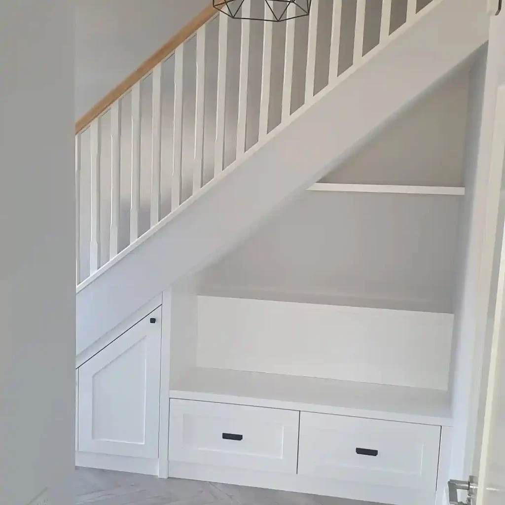 This modern under-stairs transformation includes a built-in bench with drawers and shelves. The crisp white finish keeps the space bright, while black handles add a subtle contrast. This is a great way to integrate both seating and storage without taking up extra space.