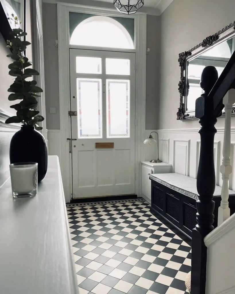 A checkered floor brings a timeless touch to this hallway. The built-in bench with storage underneath provides a practical seating solution, while a large decorative mirror enhances natural light. A black vase and candle add subtle sophistication, proving that a monochrome color scheme can still feel warm and welcoming.