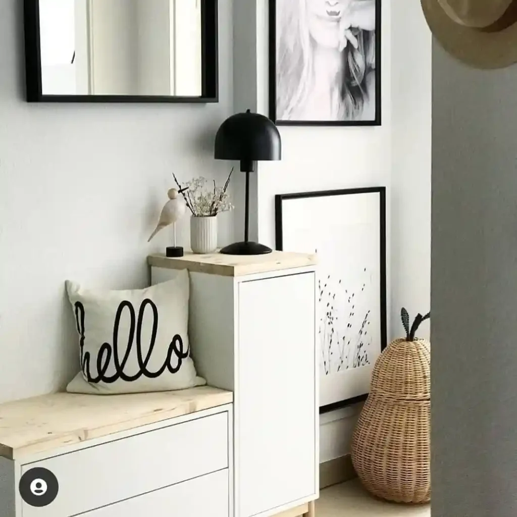 This hallway features a sleek Scandinavian design with white and wooden accents. A small cabinet provides discreet storage, while a stylish black lamp and framed artwork add personality. The “Hello” pillow on the bench makes the space inviting. This is a perfect example of how minimalism can enhance functionality without clutter.