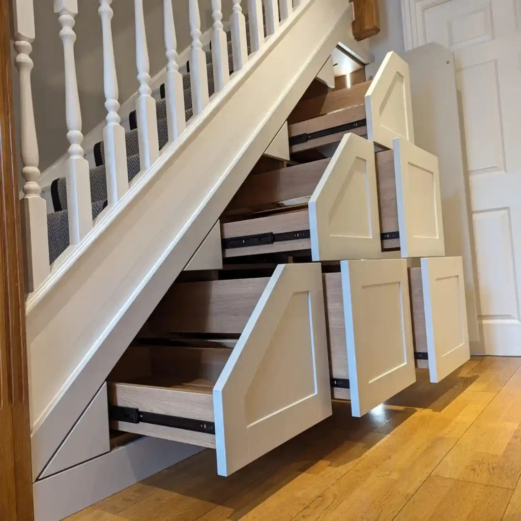 This hallway solution takes storage to the next level with multiple pull-out drawers under the stairs. Each drawer is designed for different storage needs, from shoes to bags to miscellaneous household items. The white and wood finish blends seamlessly with the flooring, keeping it stylish yet functional.