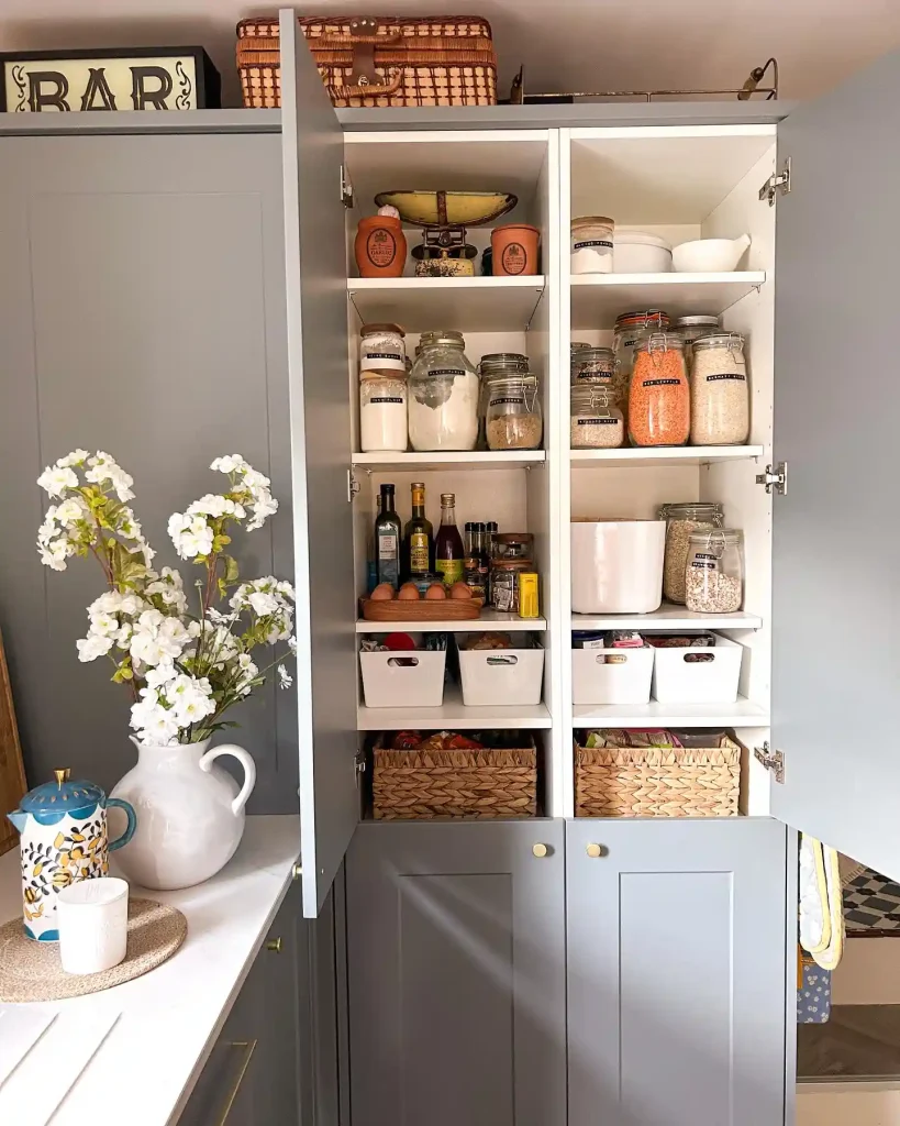 If you have a hallway near your kitchen, why not use a tall cabinet as a pantry? This setup uses labeled jars, baskets, and containers to neatly store dry goods, making everything easy to find. The soft blue cabinetry adds a cozy feel while keeping everything in order.