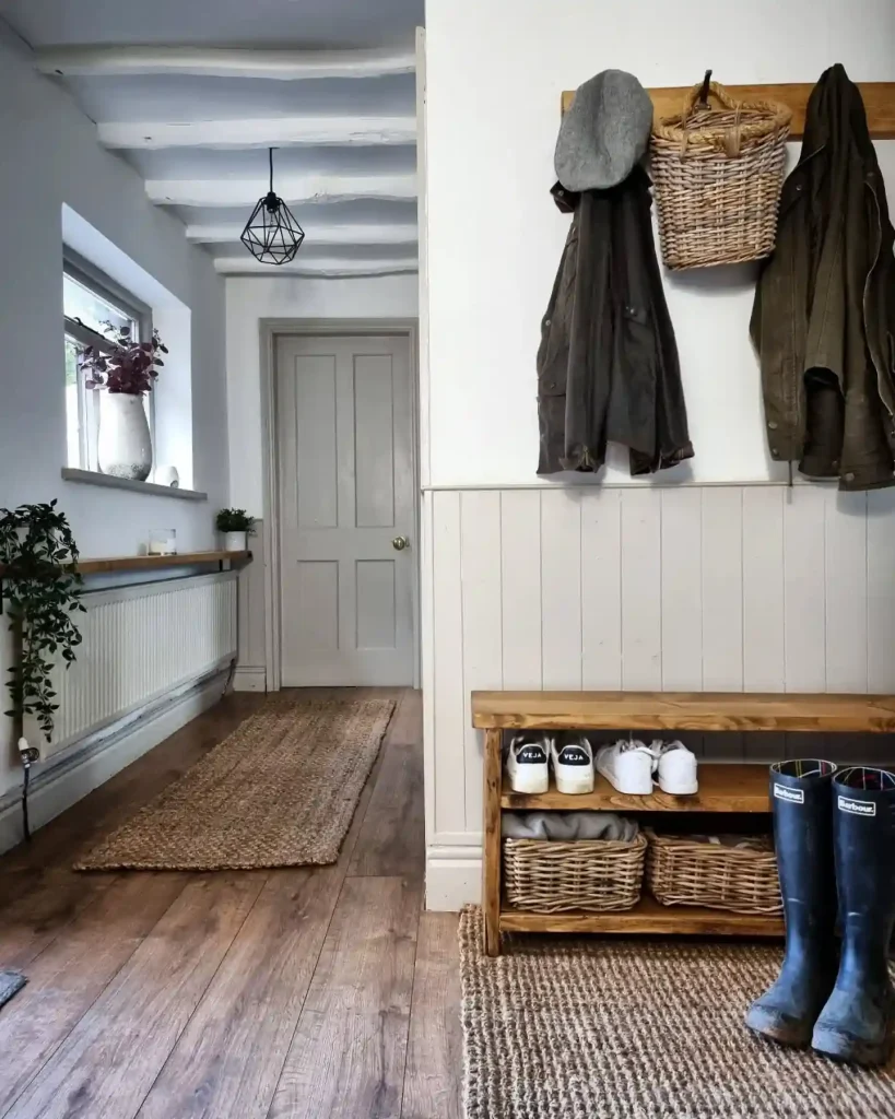 A country-style hallway with a wooden bench, woven baskets, and a coat rack. The combination of wooden elements and neutral tones creates a cozy atmosphere. Lanterns and soft lighting enhance the rustic charm, making this an inviting and practical entryway storage solution.