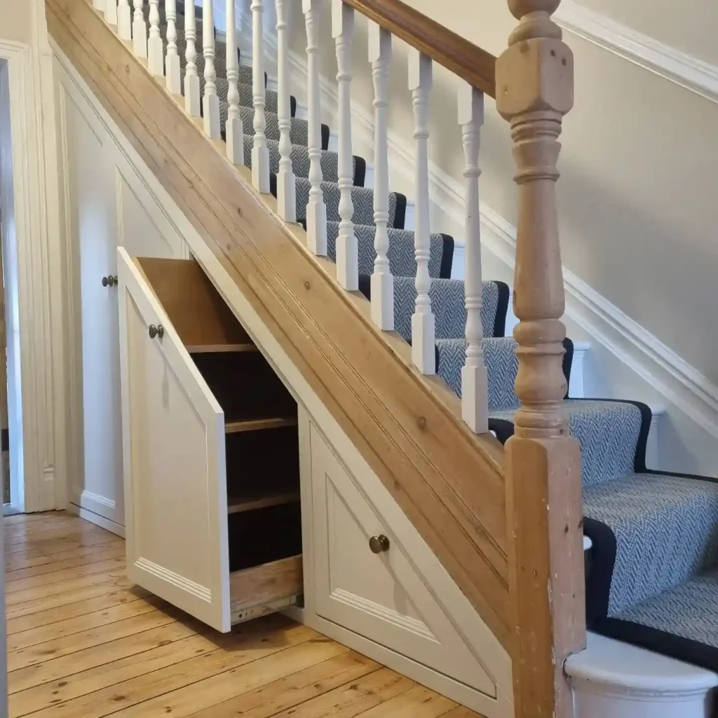 Maximizing unused space, this under-stairs storage solution features pull-out cabinets designed for easy access. These compartments can be used for shoes, seasonal clothing, or even cleaning supplies. The wooden accents complement the staircase, blending storage seamlessly into the home’s design.