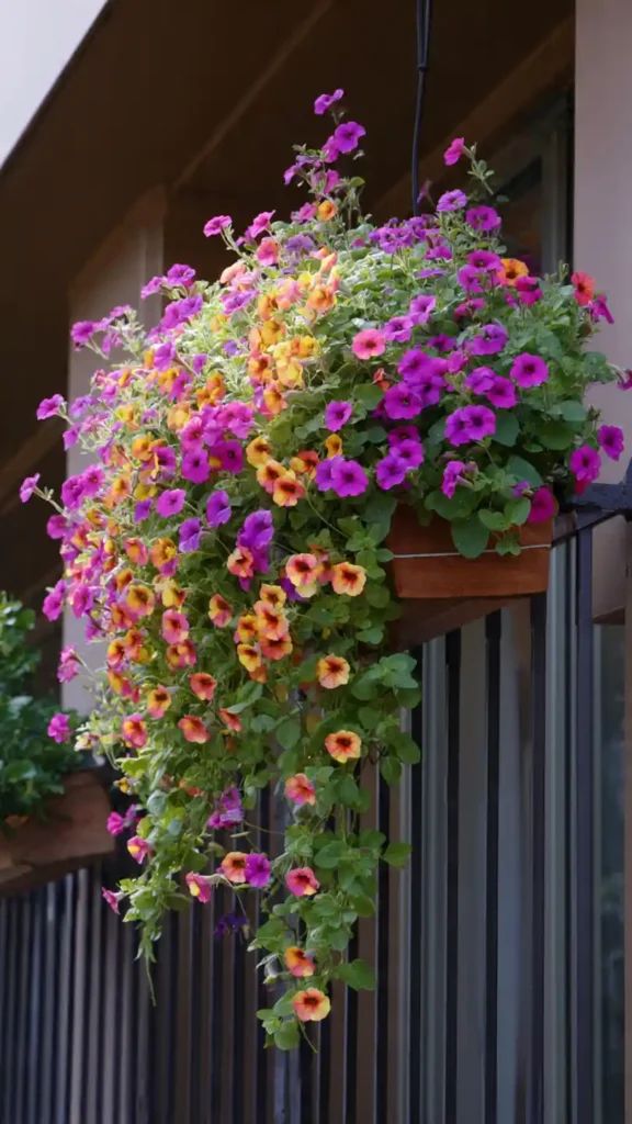 For sunny outdoor spaces, petunias, calibrachoa, trailing verbena, sweet potato vine, and dichondra silver falls are excellent choices. These plants thrive in full sun and create vibrant, cascading displays throughout the warmer months.