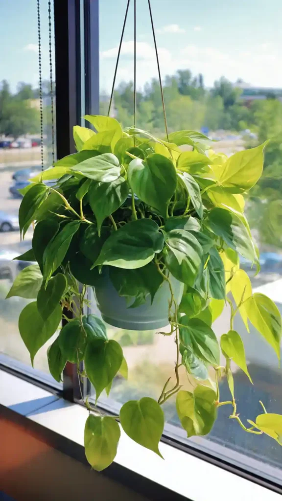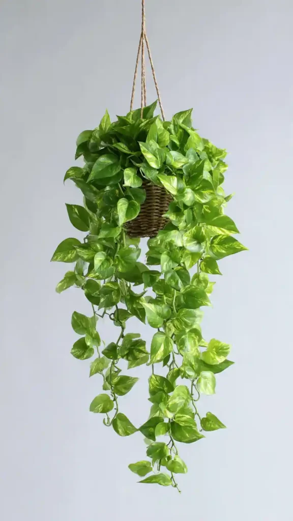 What the plant is: Pothos is a fast-growing trailing houseplant known for its heart-shaped leaves and long cascading vines. It’s one of the most beginner-friendly hanging plants available.