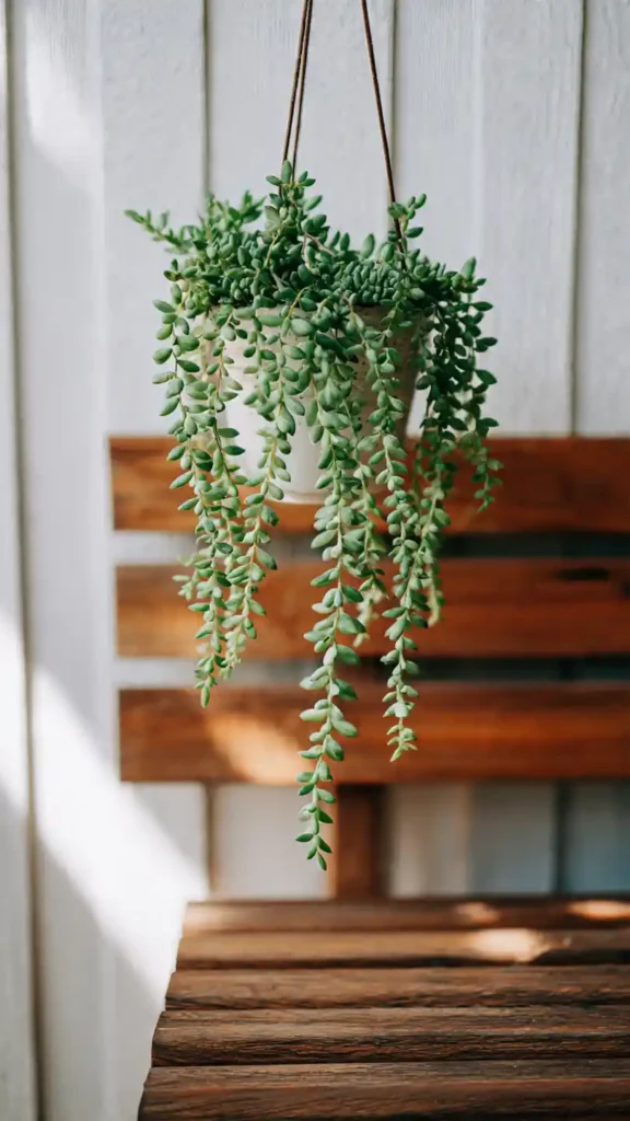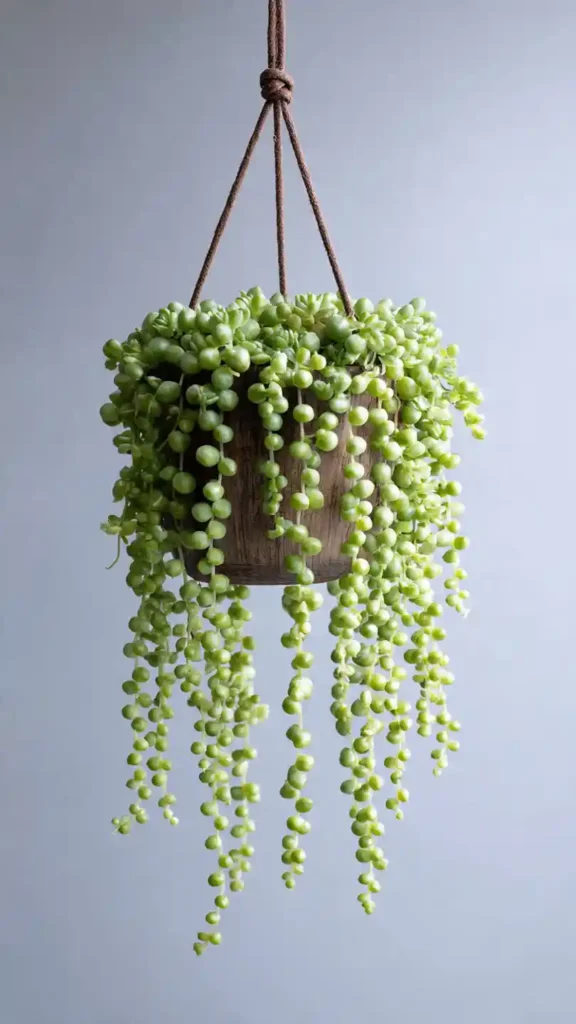 What the plant is: String of Pearls is a trailing succulent with round bead-like leaves that cascade in long strands.