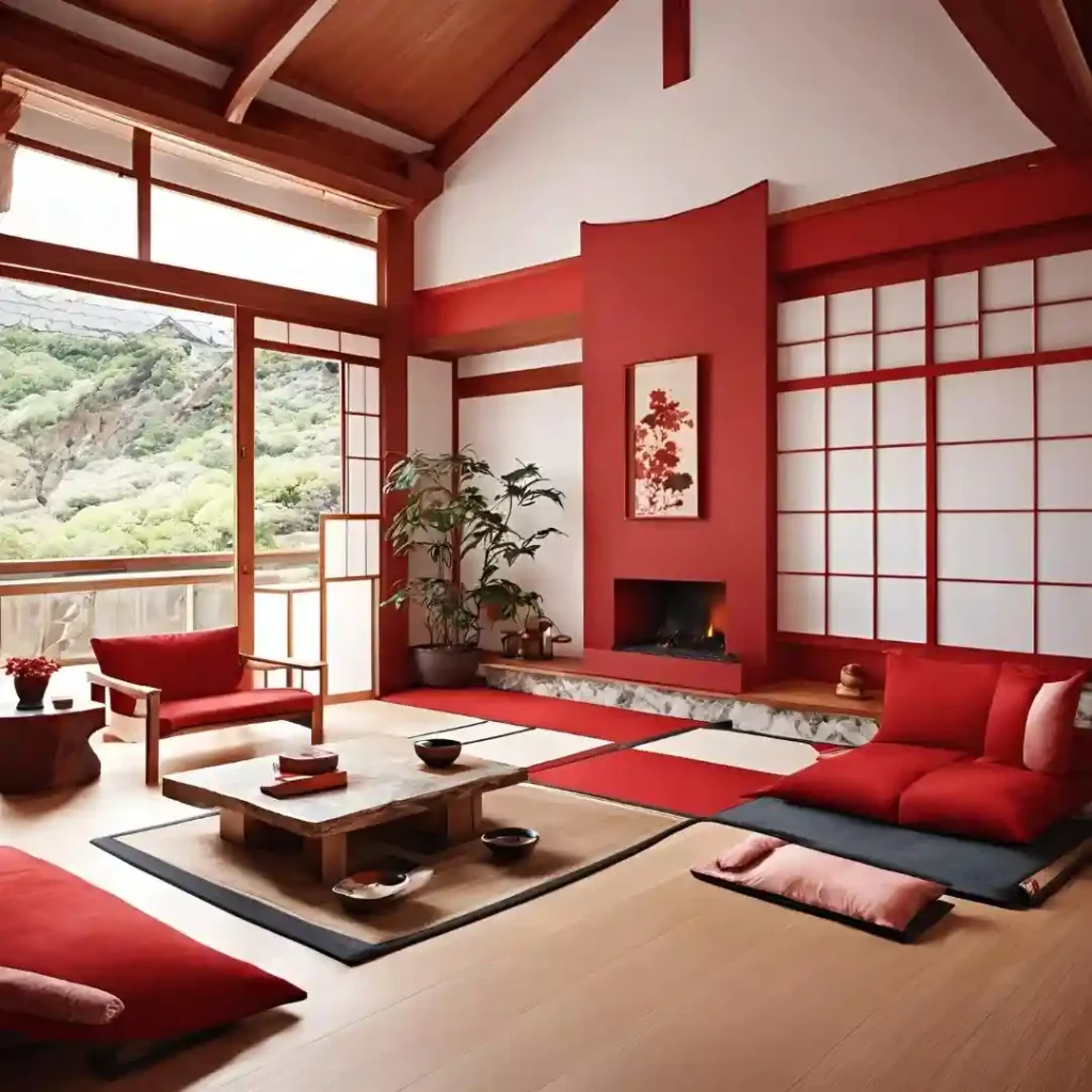 This room reimagines traditional Japanese decor with a bold red twist. The red-and-white shoji screens and tatami-inspired floor bring energy while keeping a balanced vibe. Floor cushions and a rustic low table keep things grounded, and the backdrop of a soft glowing fireplace makes it extra inviting. Paired with a mountain view, this space is perfect for someone who loves strong colors but still wants a peaceful, grounded living room.
