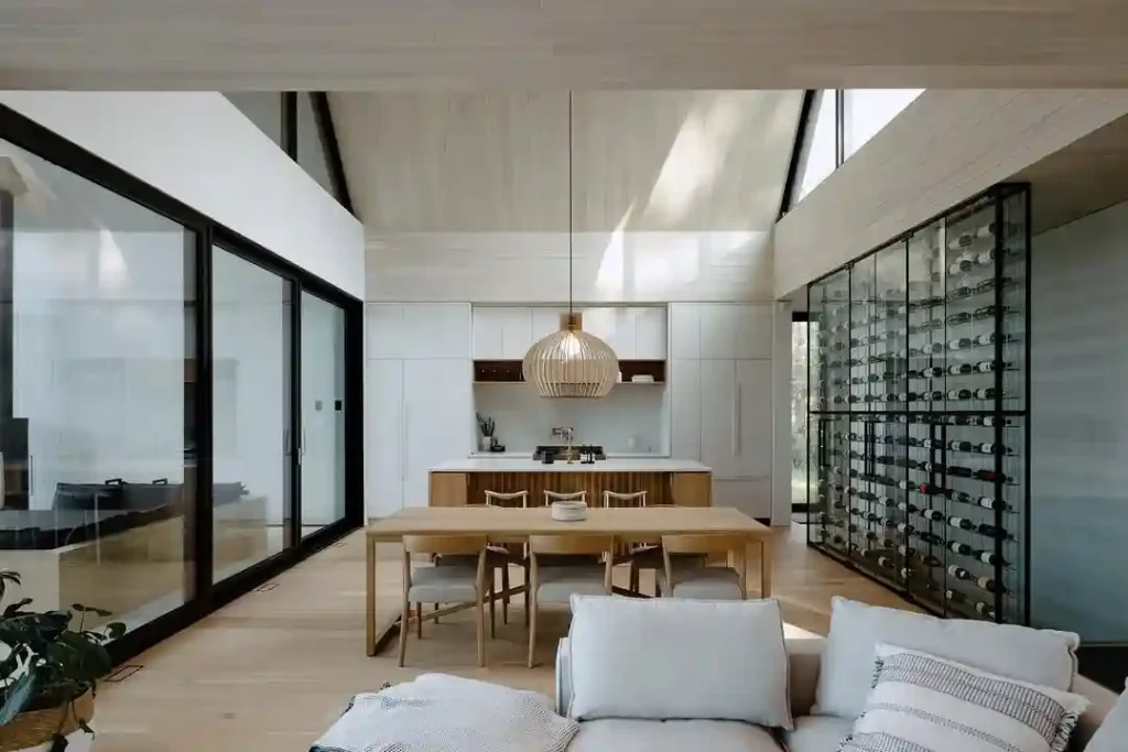 This space takes the best of Japanese and Scandinavian styles. High ceilings and glass walls let natural light shine across the kitchen and dining area. The wooden elements and soft neutral palette keep it grounded. Everything here feels clean, breathable, and ready for slow, intentional living — from the hanging lamp to the simple dining setup. It’s ideal for a calm yet modern family lifestyle.