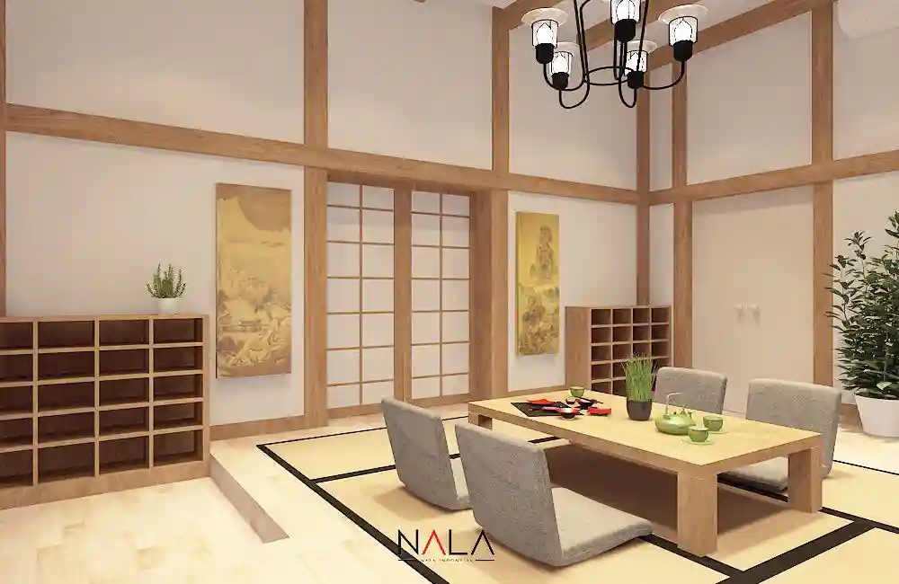 This clean-lined room keeps things simple with a low wooden table, neutral tones, and built-in shelving. The subtle wall art and the soft cushions give just the right amount of personality without overwhelming the space. It’s ideal for those who value slow meals and mindful moments. The lighting and layout reflect the traditional Japanese way of living — peaceful, functional, and beautifully minimal.