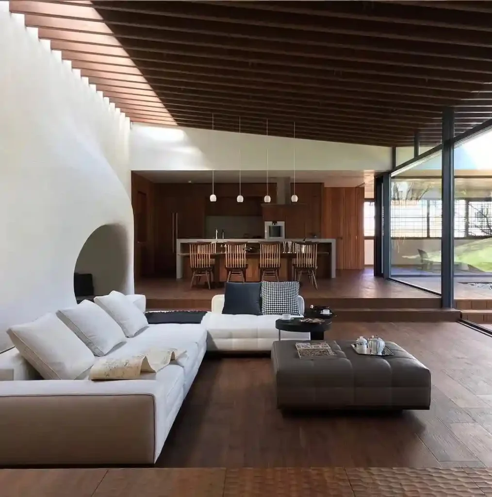 This room is where modern design meets the heart of wabi-sabi. The curved white wall softens the sharp lines, while wooden tones add warmth. The low sectional sofa paired with dark flooring and a sleek dining area in the back makes this space ideal for family life or quiet evenings. Even with its contemporary touches, it still reflects that peaceful, pared-back Japanese style.