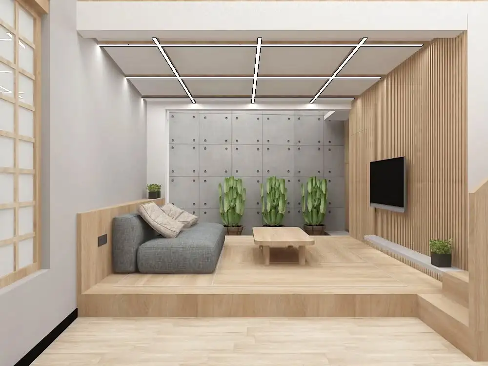 A perfect blend of Japanese simplicity and modern structure, this living area is all about subtle details. The built-in couch, low wood table, and step-up platform give it a layered, intentional look. The soft lighting and wooden slats warm up the space, while potted plants bring in freshness. The concrete panel wall adds an industrial edge without overpowering the calm. It’s ideal for someone who loves modern design but craves a soothing space.