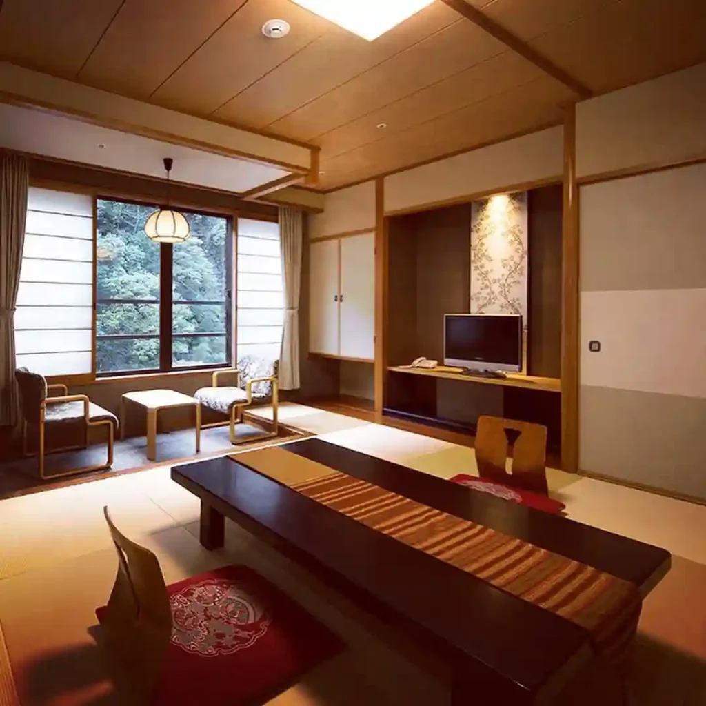 This room feels like stepping into a peaceful ryokan (traditional inn). Floor cushions, a low table, and large windows overlooking nature make it perfect for tea time or relaxed reading. The muted lighting and soft colors give it a soothing vibe, while small modern touches — like the flat-screen TV — blend in without disrupting the calm. It’s a great balance of old and new.