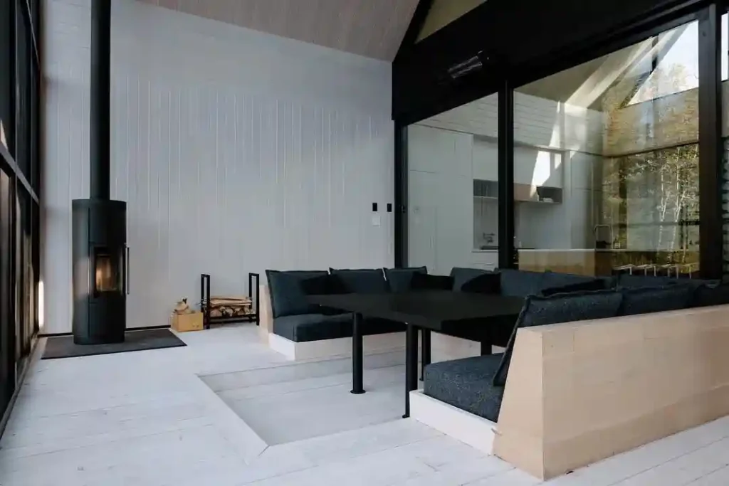 This stylish sunken seating area feels grounded and cozy. The pale wood flooring and deep black cushions create a calming contrast, while the fireplace in the corner adds a warm focal point. Large glass panels bring in natural light, reflecting the outdoor serenity. Though modern and minimal, the lowered dining layout keeps the traditional Japanese essence alive — ideal for peaceful dinners or long chats by the fire.