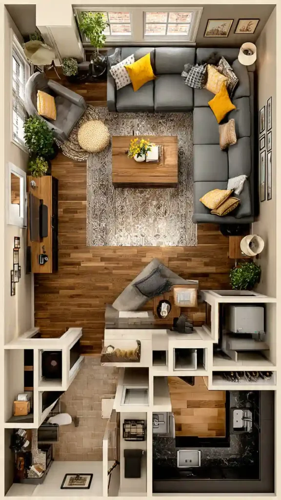 An L-shaped sectional frames the seating area and naturally defines the living room zone. The coffee table sits within easy reach, and the layout encourages relaxed seating without extra furniture.