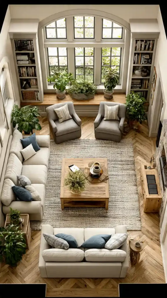 This layout focuses on conversation rather than screen viewing. Seating is arranged facing inward, with sofas and chairs positioned around a central coffee table. The room feels balanced and social, with no single media focal point.
