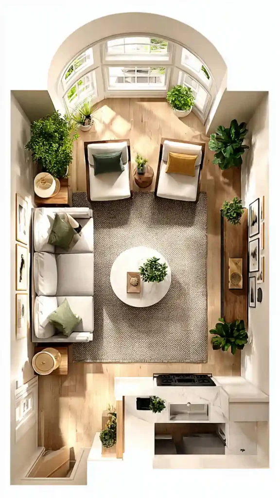 This layout uses simple furniture placement with open spacing. A sofa and chairs are arranged loosely around a central coffee table, allowing the room to feel airy and comfortable. Walkways remain open and uncluttered.