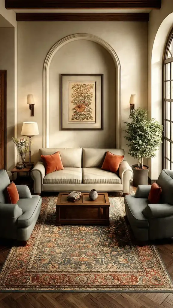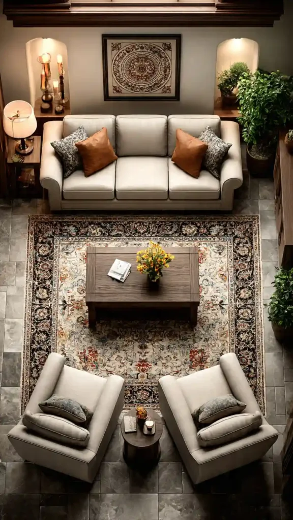 Furniture is arranged evenly on both sides of the room, creating a structured and organized look. A sofa faces matching chairs, and the coffee table is centered on the rug. This layout feels calm and intentional.
