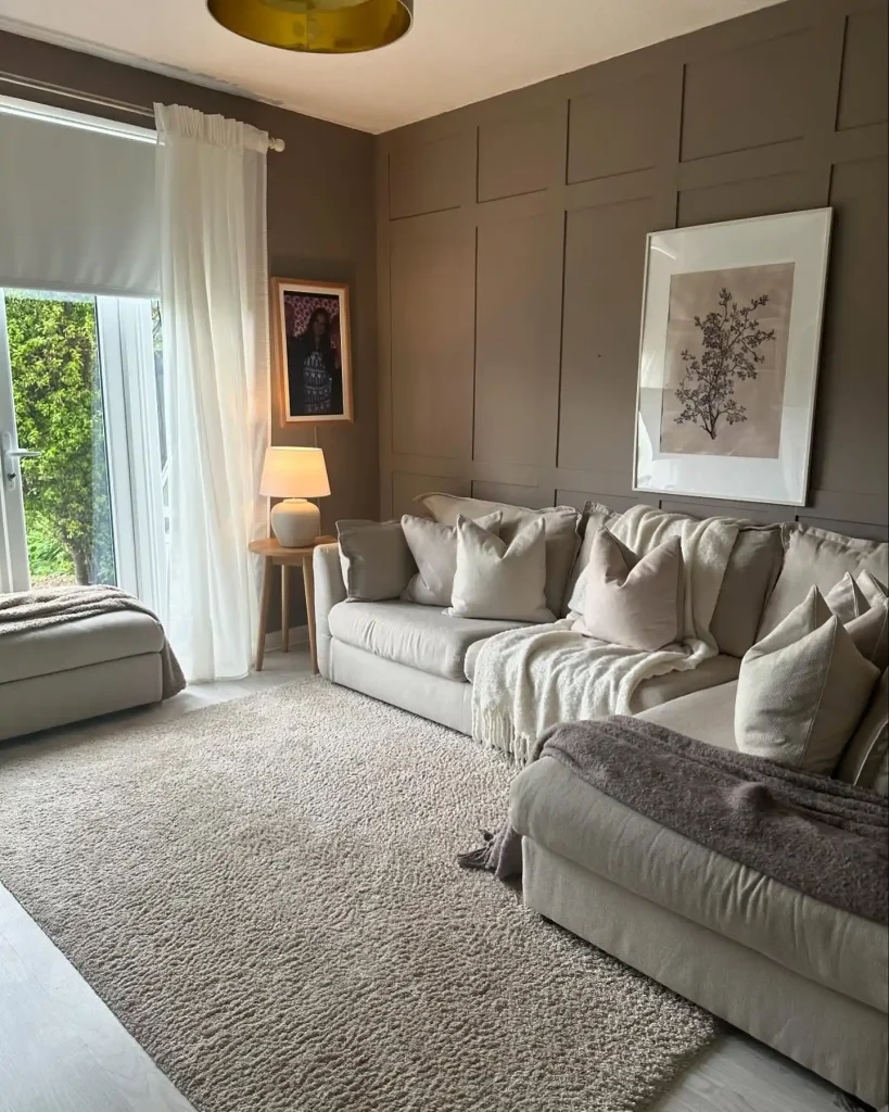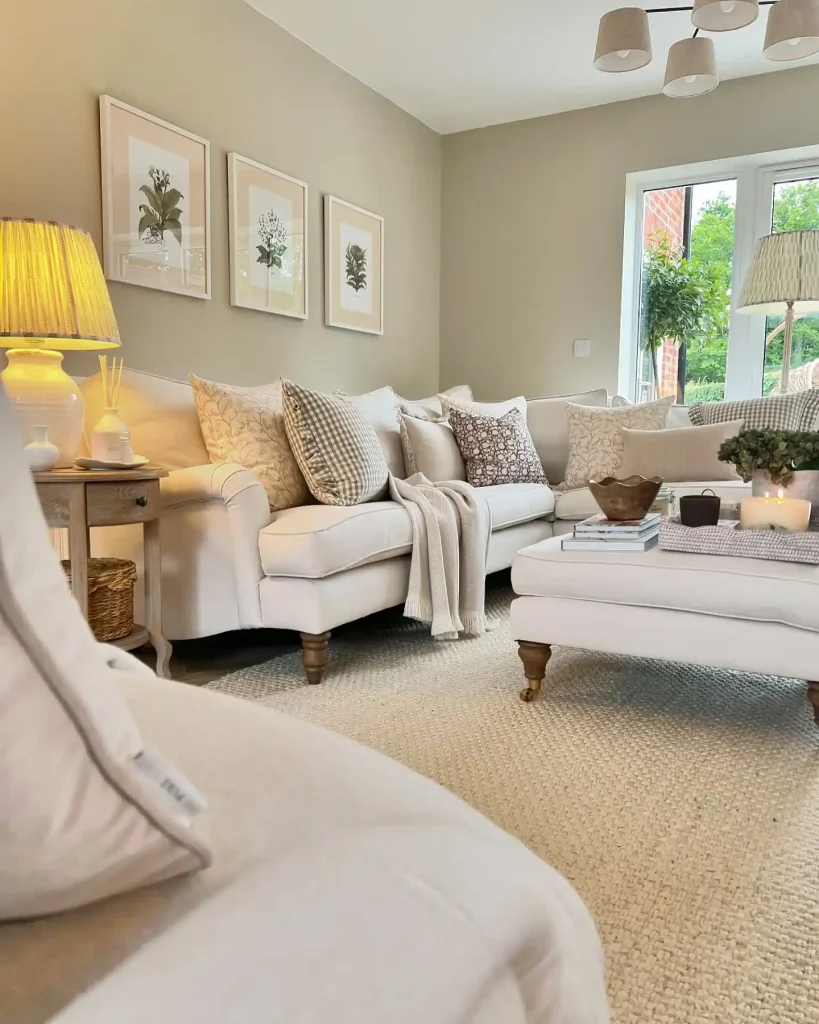 Transform your living room into a cozy retreat with a plush neutral-toned sofa, layered with soft cushions and throws for ultimate comfort.