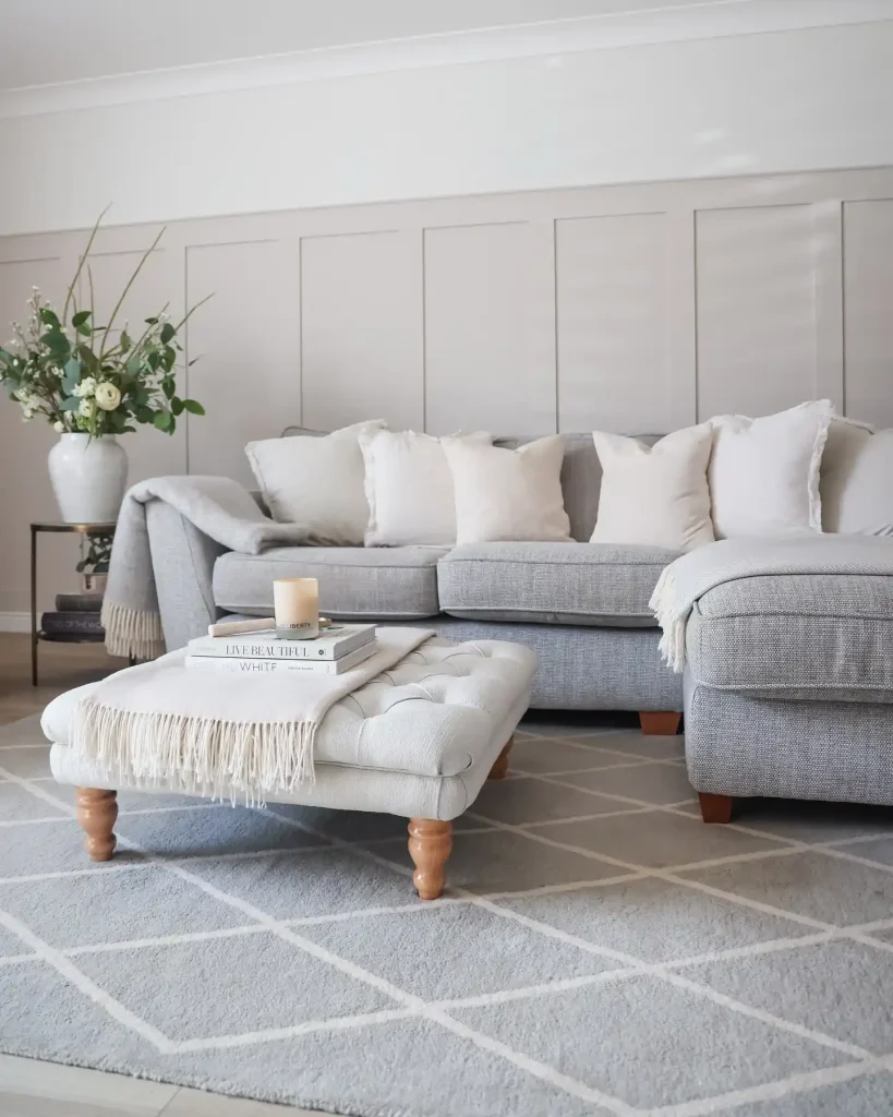 Create a warm and inviting space with this stylish gray sectional sofa, perfectly complemented by soft neutral pillows and a tufted ottoman.