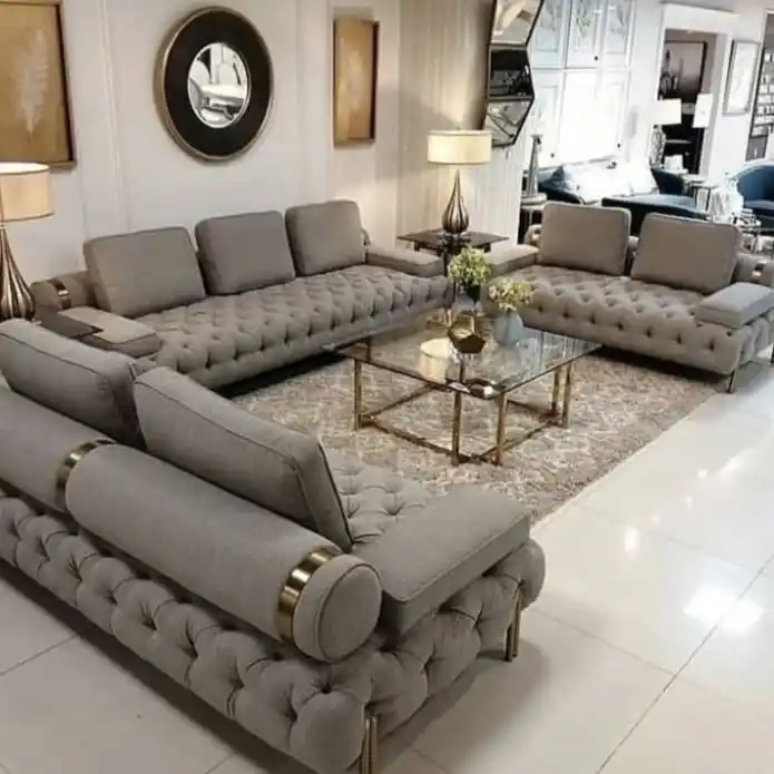 Upgrade your living room with a luxurious tufted sofa set featuring gold accents for a chic, modern touch.