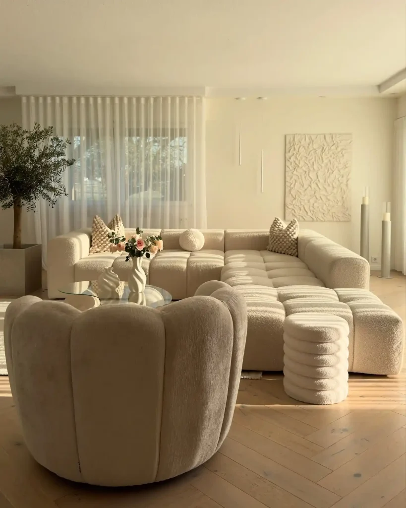 The plush, textured upholstery and deep-seated design create a warm and inviting atmosphere. Paired with a unique rounded accent chair and soft neutral decor, this setup exudes modern elegance.