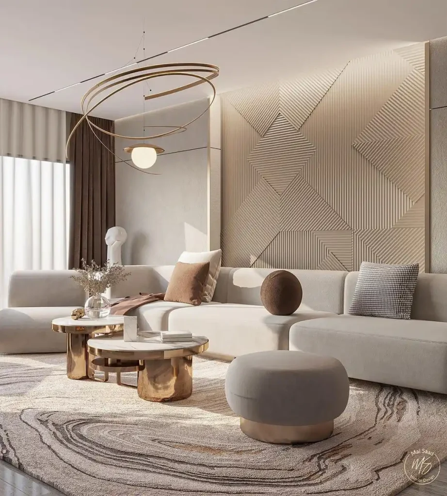 Enhance your living space with a sleek, neutral-toned sectional sofa that exudes modern elegance. A textured accent wall adds depth, while gold and marble coffee tables bring luxury.