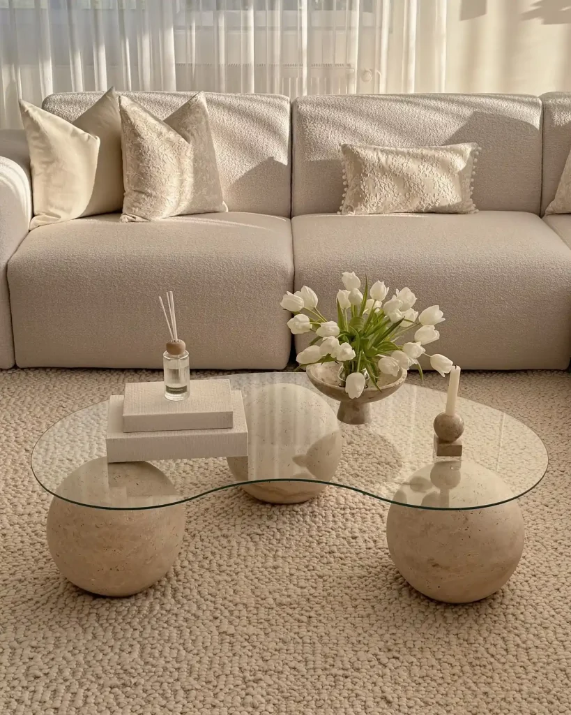 The sculptural glass coffee table with stone base adds a modern artistic touch, perfectly complementing the cozy, textured rug. Soft natural light filtering through sheer curtains enhances the warm and airy ambiance.