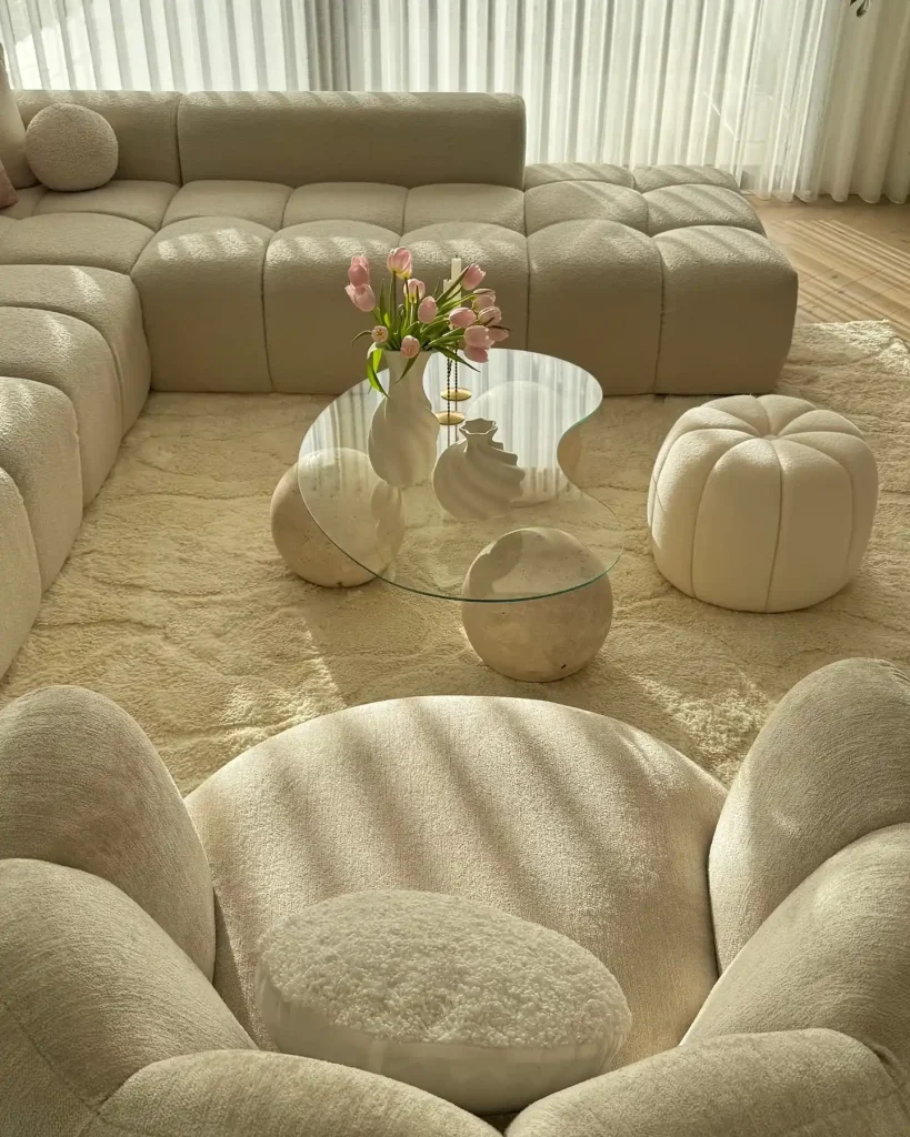 The soft curves and textured upholstery enhance comfort, while the sculptural glass coffee table adds an artistic touch. A matching round ottoman and cozy accent chair complete the setup, offering a seamless blend of elegance and relaxation.