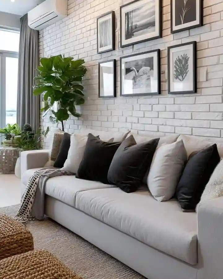 The classic combo of black and white photography gets a fresh update when displayed over a white brick wall. The layout feels casual but intentional, with varied frame sizes and a mix of nature and abstract prints. Paired with black-and-white pillows and natural textures like jute, this look feels timeless yet modern.