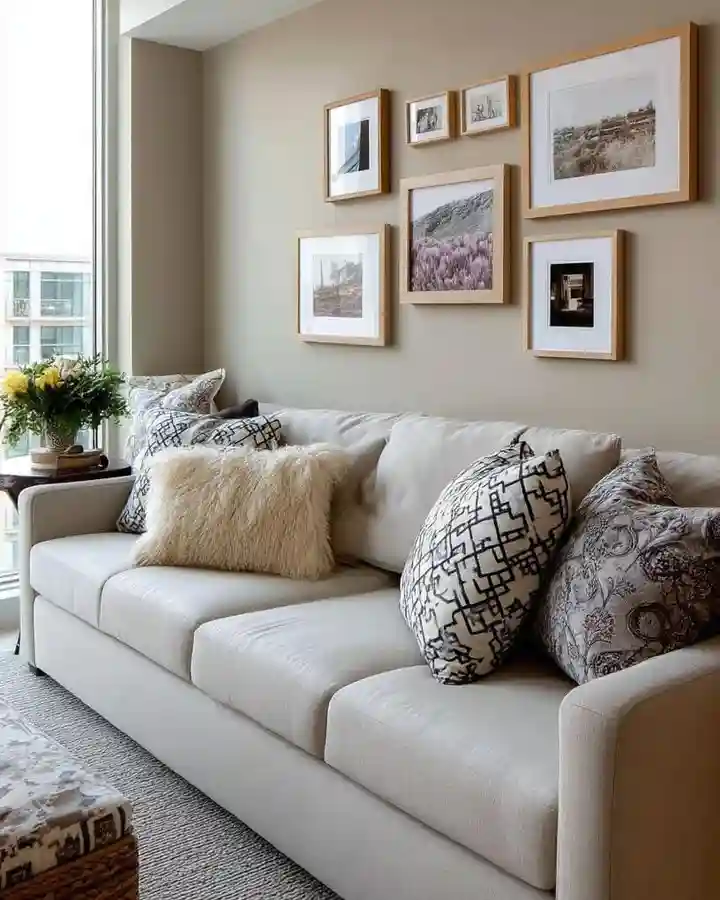 A well-spaced photo grid above the couch brings harmony to this soft-toned living room. The artwork leans into soft landscapes and calming color tones, perfectly complementing the beige wall and cream sofa. Layered neutral pillows and a textured throw complete the look. It’s minimal but warm—ideal for subtle styling.