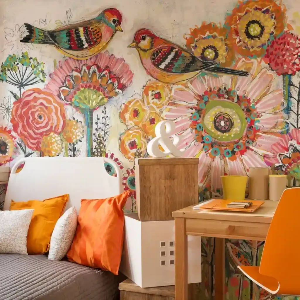 Oversized bird and flower wall art instantly makes this bedroom feel like a creative retreat. Bright orange cushions, wooden furniture, and playful details enhance the colorful mural. It’s a great reminder that maximalist design can lean heavily into art, letting a statement wall lead the entire room’s theme.