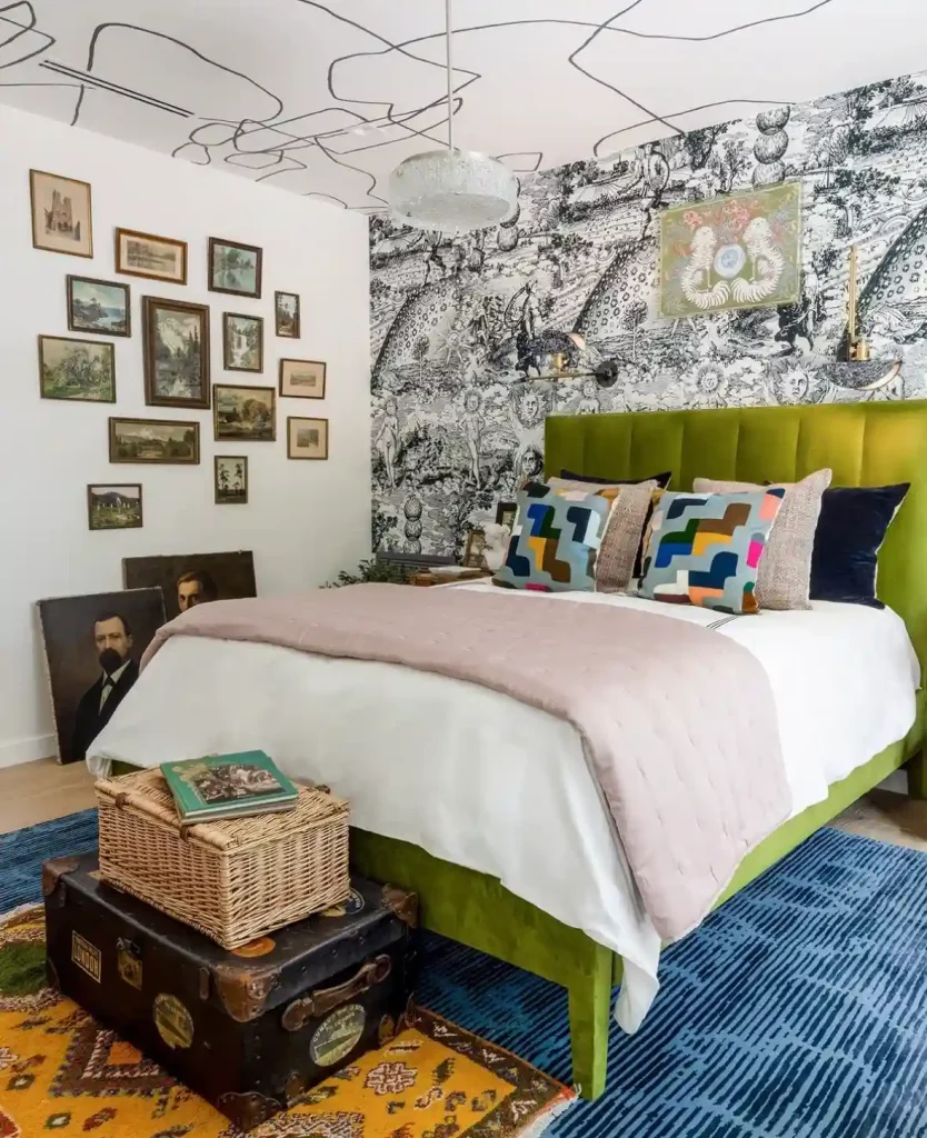 This bedroom feels like stepping into a gallery. The black-and-white illustrated wallpaper creates instant drama, while colorful geometric pillows and a green velvet headboard bring energy to the space. Vintage art pieces and antique trunks add personality and depth. Even the ceiling carries a playful line design, proving maximalism can turn every surface into part of the story.