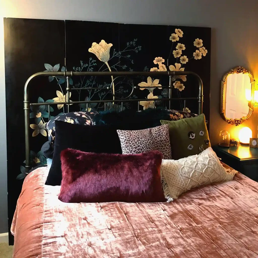 The moody black floral backdrop behind the brass bed instantly draws the eye. Paired with jewel-toned pillows—like plum, emerald, and leopard print—the space feels rich and glamorous. The soft velvet bedding adds tactile comfort, while the golden-framed mirror and warm lighting highlight the luxurious atmosphere. This design shows how maximalism isn’t just about bright colors—it can also lean into dark romance and texture layering.