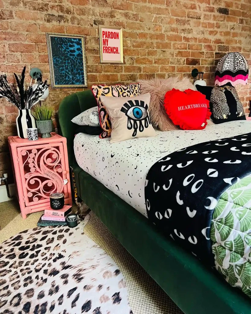 Exposed brick walls meet bold, playful décor in this edgy maximalist space. The bed is layered with quirky pillows—from leopard print to a bright red “Heartbreaker” cushion—that instantly add personality. A pink carved side table stands out as a fun accent piece, while animal prints on the rug tie into the eclectic vibe. The mix of patterns, textures, and cheeky artwork makes this room feel energetic and unapologetically stylish.
