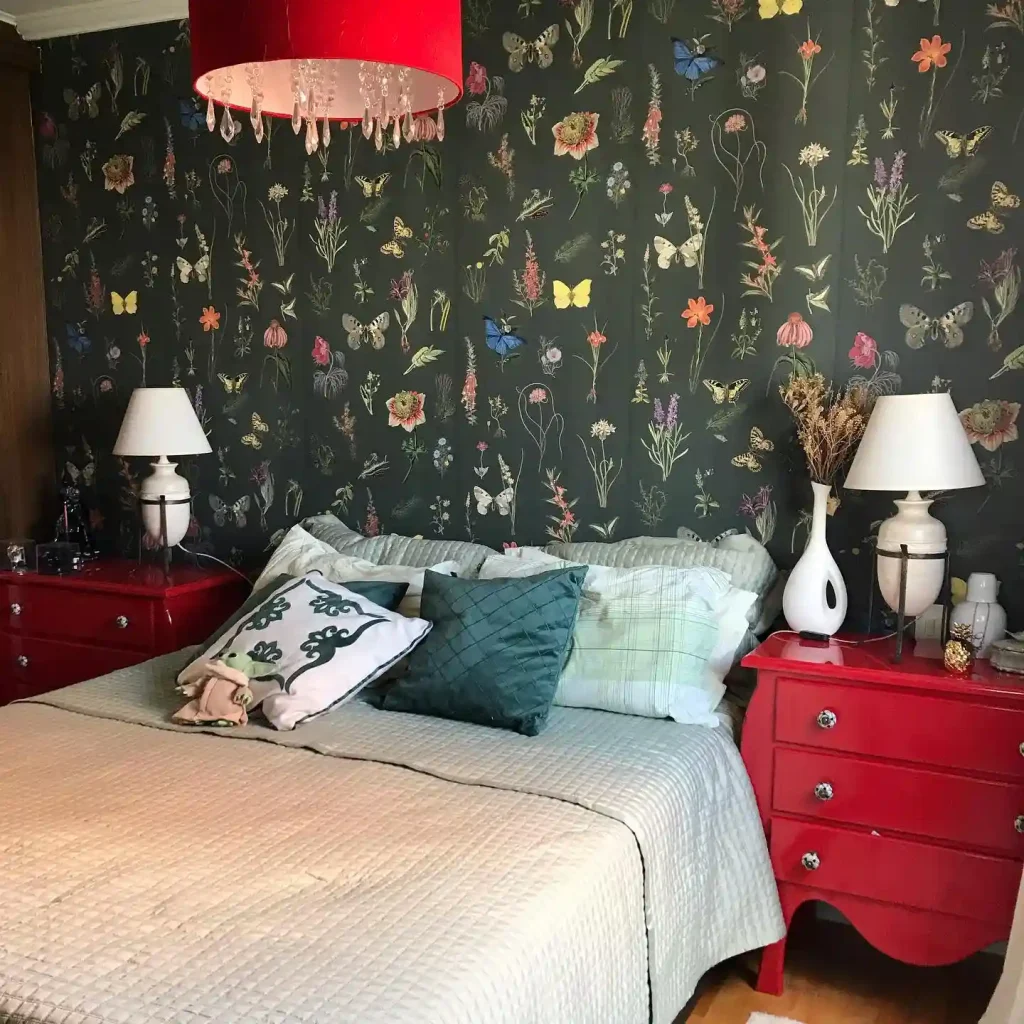 This room pairs dark floral wallpaper with pops of red through the side tables and lighting. A mix of green and neutral bedding tones balances the darker elements, while the nature-inspired wall pattern adds whimsical detail. The combination of botanical prints and bold furniture choices makes the space vibrant yet grounded in natural beauty.