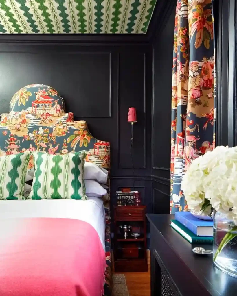 Here, the dark paneled walls and bold patterned headboard create a striking backdrop. The green and white cushions pop against the deep tones, while the coral-pink blanket adds warmth. Patterned curtains continue the maximalist theme, while a fresh bouquet on the side table softens the look. This design shows how bold patterns, when thoughtfully combined, create a cozy yet elevated bedroom space.
