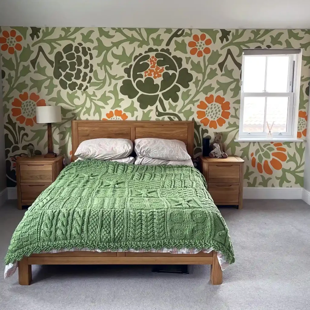 This room channels vintage charm with oversized floral wallpaper in earthy green and orange tones. The natural wood bed and side tables ground the look, while the chunky green knitted blanket adds cozy texture. The design strikes a balance between bold pattern and simplicity, proving maximalism can feel fresh and approachable with just a few strong elements.