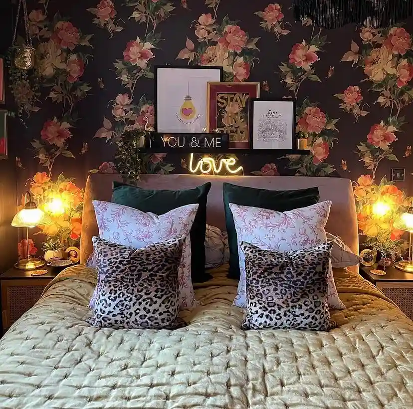 Golden lighting and a dark floral wall set a cozy, romantic tone here. Leopard print cushions and patterned pink pillows bring texture and contrast, while the neon “love” sign above the bed adds playful personality. This space highlights how maximalism can combine classic romance with modern statement pieces for a bedroom full of charm and character.