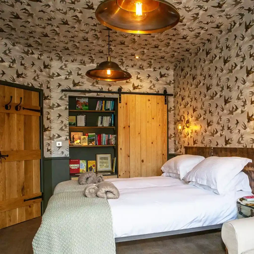 With bird-patterned wallpaper covering the walls and ceiling, this bedroom feels immersive and bold. Natural wood doors and shelving balance the busy patterns, while industrial pendant lights add warmth. The simple white bedding grounds the look, making the wallpaper the star of the room. This design shows how maximalism can also lean into rustic charm when mixed with natural materials.