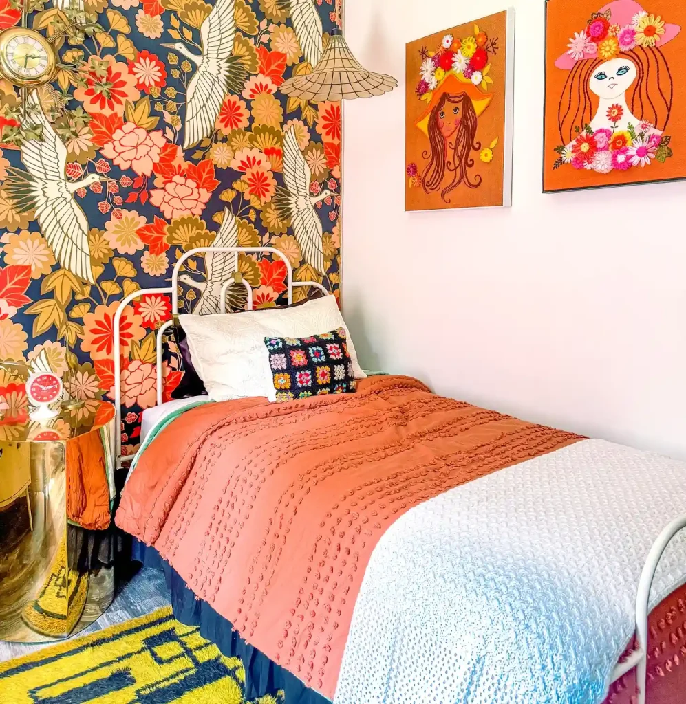 A bold floral wall with cranes sets a retro tone in this bedroom. Paired with burnt orange bedding, crochet pillows, and playful wall art, the space feels nostalgic yet vibrant. The metallic side table and patterned rug bring extra layers of texture. This design shows how maximalism can mix vintage flair with modern touches for a cozy, character-filled retreat.