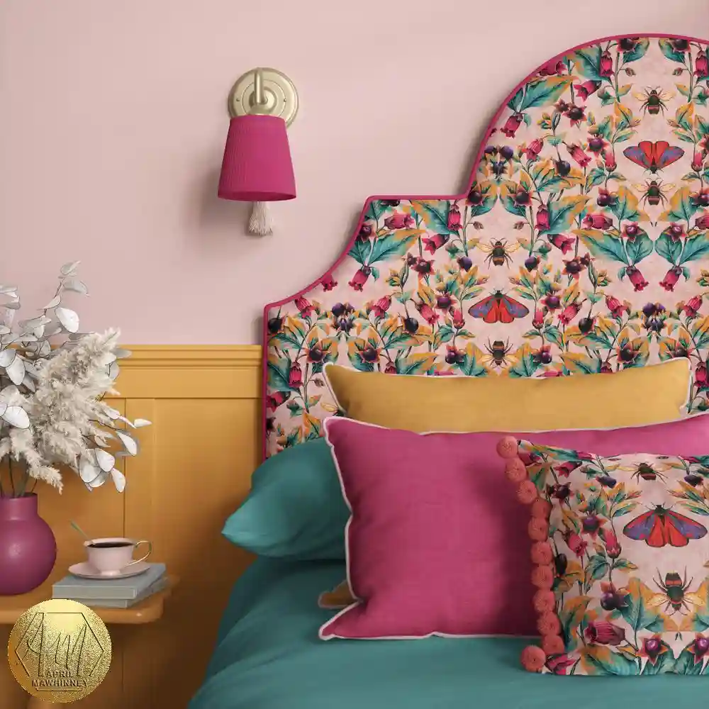 A floral headboard with bees and butterflies brings nature indoors, paired with jewel-toned bedding in pink, teal, and mustard. The blush walls and yellow paneling provide a colorful yet soft backdrop. The mix of cheerful patterns and rich fabrics gives the room a playful yet inviting energy—perfect for anyone who wants a maximalist style that still feels lighthearted.