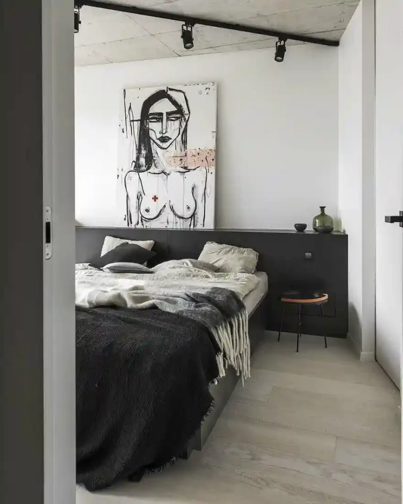 This bedroom combines edgy style with minimalist design. A bold black accent wall frames the low bed, paired with monochrome bedding and layered throws for comfort. The oversized modern artwork above the bed steals the spotlight, while track lighting emphasizes the clean architectural lines. It’s a space that proves minimalism doesn’t have to be plain.