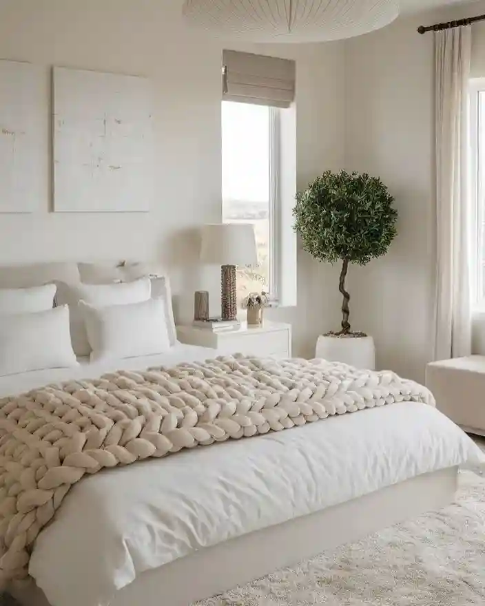 6. Bright White Minimalist Bedroom with Chunky Knit Blanket