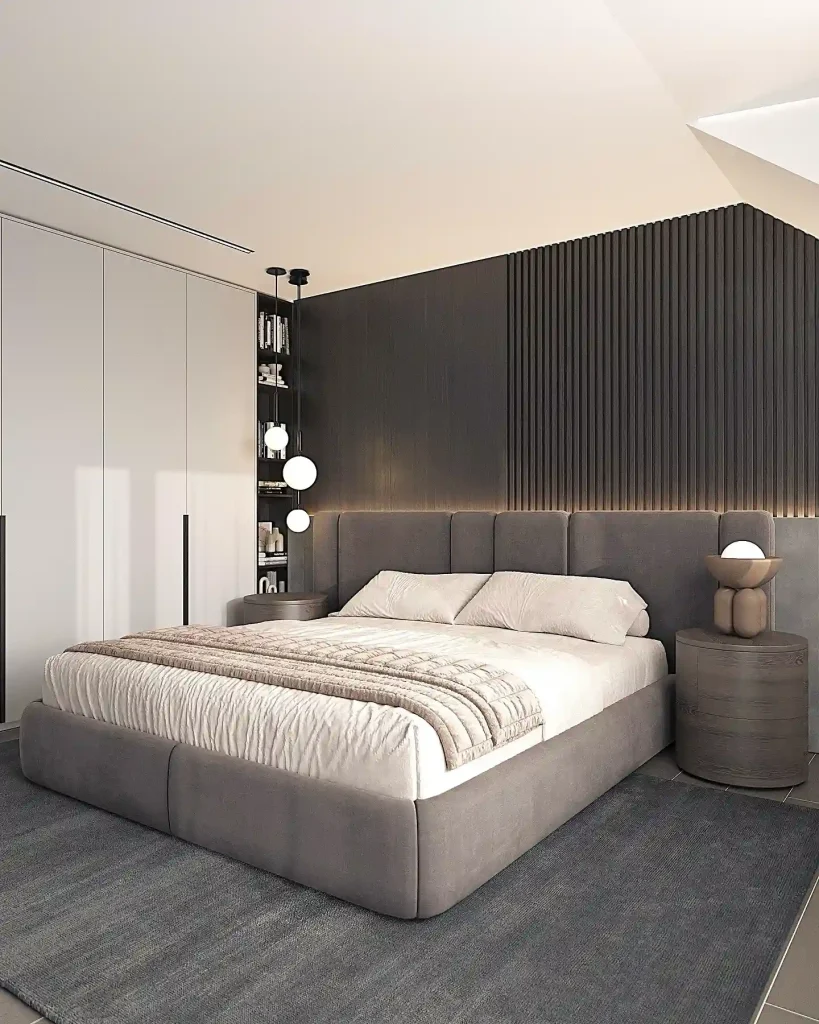 Here, a bold charcoal feature wall adds depth to the space while backlighting creates a warm glow. The upholstered bed in gray tones pairs well with the dark backdrop. Round bedside tables and modern pendant lights balance the sharp lines, making this minimalist room feel modern yet cozy.